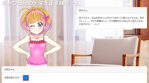 Twitterを見てたらこんなトレンドに「#ネトウヨ兄のデマを正す妹ゲーム」とかいうのがあったんですよね。 #ネトウヨ兄のデマを正す妹ゲーム hashtag on Twitter 「なんやねんこれwww」と思いつつ、ゲーマーたるもの気になるゲームはやってみよう、ということ…