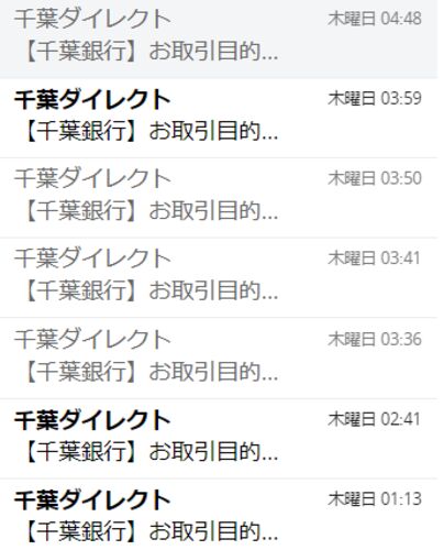 千葉ダイレクトさんからメール。千葉ダイレクトって何だと思って件名をみたら「【千葉銀行】お取引目的等の確認のお願い」とのこと。なるほど千葉銀行の何らかのサービスか。 これが真夜中から明け方にかけて何件も来てました。 こんなクソスパムフィッシン…